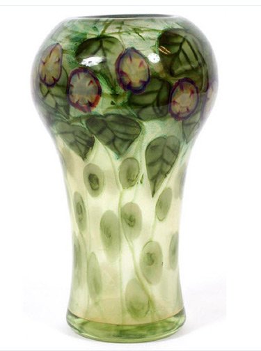 Favrile glass is a type of iridescent art glass designed by Louis Comfort Tiffany. It was patented in 1894 and first produced in 1896. It differs from most iridescent glasses because the color is ingrained in the glass itself, as well as having distinctive coloring. Favrile glass was used in Tiffany’s stained-glass windows.