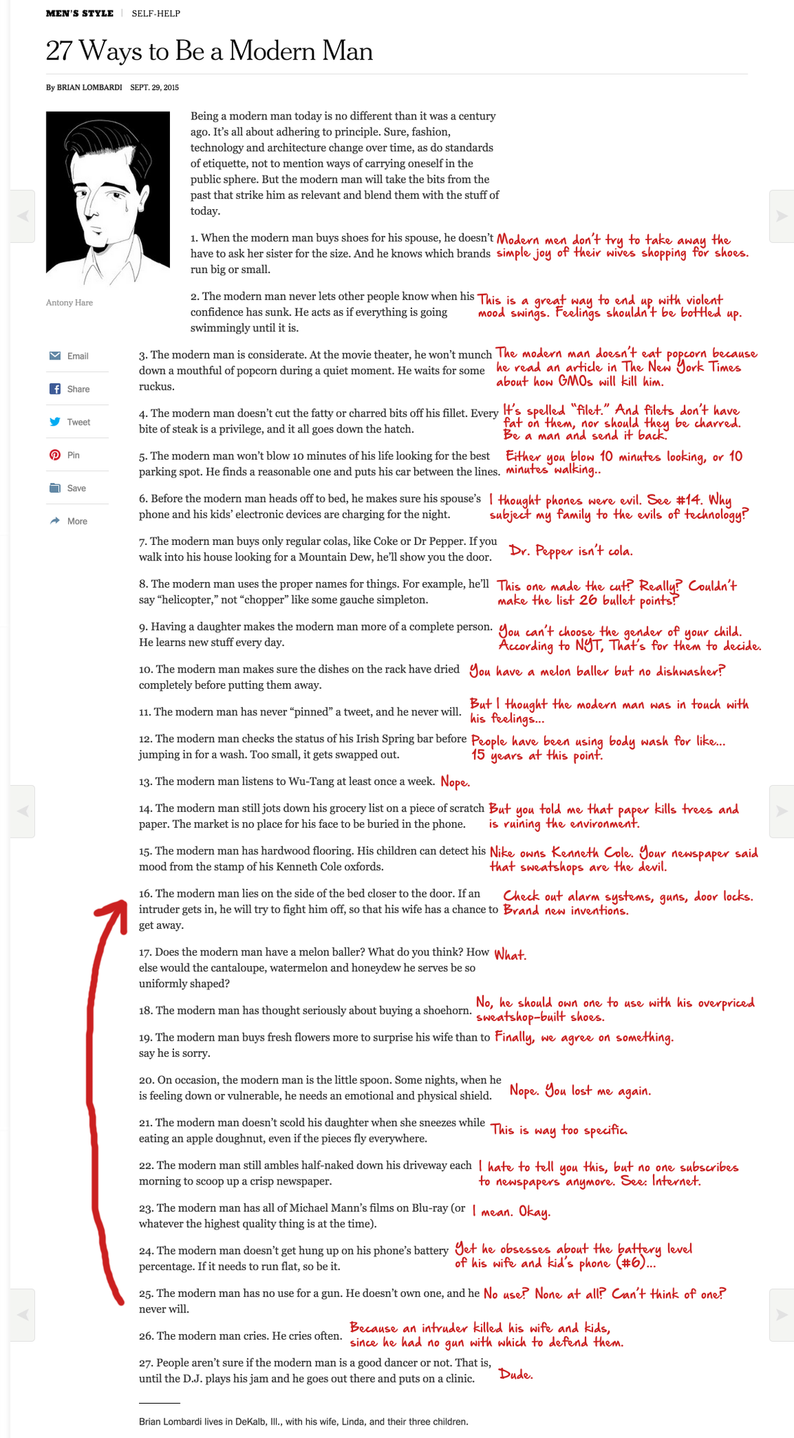 Via Karen L. Myers and Ed Driscoll at Instapundit, a NYT column defining “The Modern Man” with replies in red ink.